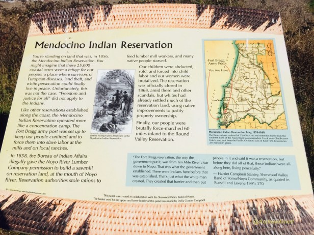 You’re standing on land that was, in 1856, the Mendocino Indian Reservation. You might imagine that the 25,000 coastal acres were a refuge for our people, a place where survivors of European diseases, land theft, and white persecution could finally live in peace. Unfortunately, this was not the case. ‘Freedom and justice for all’ did not apply to the Indians.