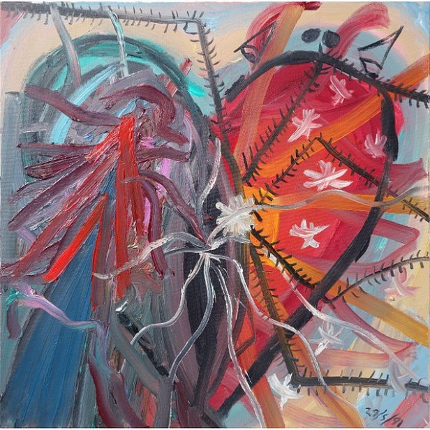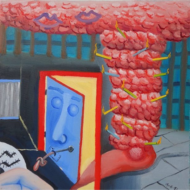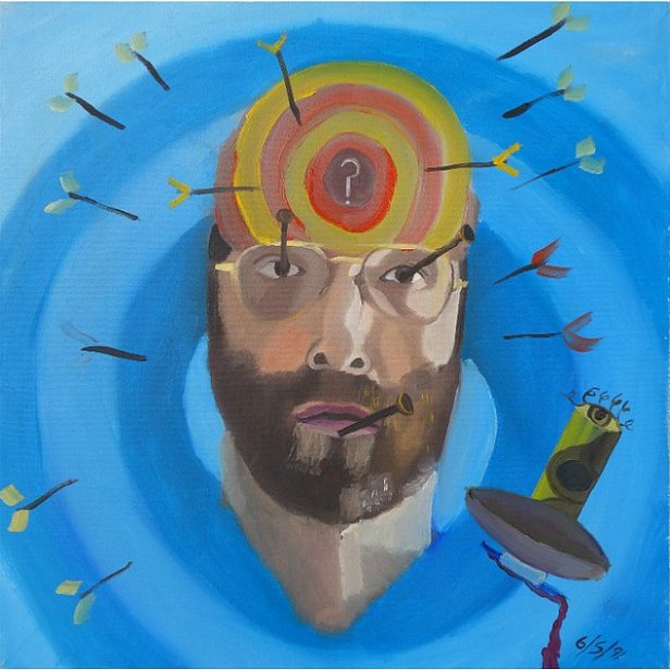 Self Portrait # 8 was completed May 14. He describes this painting as, “The ego splitting like a cancer cell as it comes under attack, a gory mess.” He goes on to write: