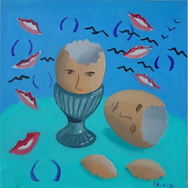 . . . I find Picasso peculiarly bland stripped of his technique. Well the later paintings anyway. There is nothing wrong with my technique except when I have to try too hard because of the demands of the imagery. People keep me in misery because they keep coming up to me with some gossip about my past and I know nothing of theirs. The eggs have been emptied like a head stripped of its contents. It has nothing left in it, no more secrets, they went to satisfy somebody’s appetite, some body that has power over me. They enjoyed every tasty mouthful. Two eggs? It was the same yesterday. Needless to say I feel suicidal so I painted in Van Gogh’s crows from his final, suicide picture of the wheat field. E.S.P. horns, voices as mouths grinning. Birds come from eggs so the crows can also be like my thoughts flying away. All this sort of gossip increases my fears of telepathy and is the main reason I feel suicidal.