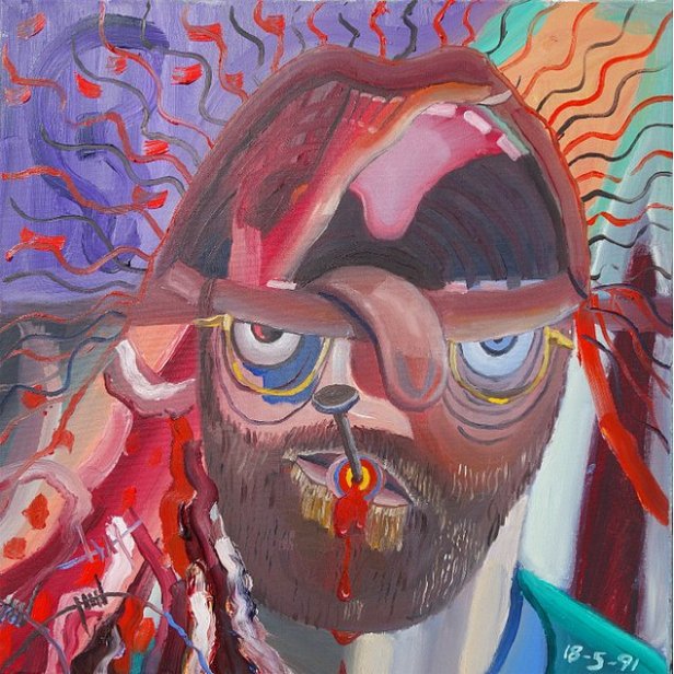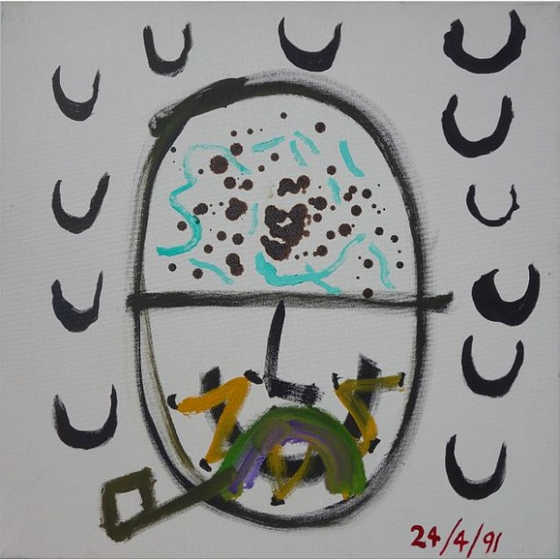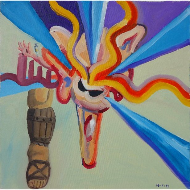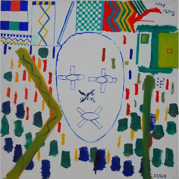 Why miss a golden opportunity to describe through paint total mental disintegration. Painted the day after the last portrait, the horns of E.S.P. are supposed to function as mouths. Total lack of concentration meant a graffiti effect again. The spots on the brain of the head are real blood to try and get over the mental pain I was experiencing. I was smoking heavily, hence the pipe. No eyes to see what is really going on and a stitched up mouth.