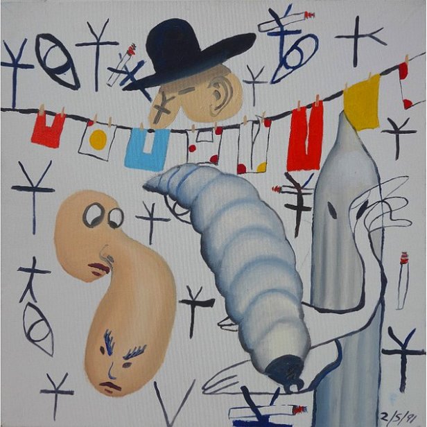 The spirit, expressed by a bird is crushed by the maggot. My Oedipus complex is represented by the hooded phallus. My conflict of thought expressed by the man with two heads, one is a nose. The clothes line is to say that all my dirty washing, or thoughts are on display. The split crosses are a reference to schizophrenia being a type of ego crucifixion. The man with the hat is watching me and keeping everything under his hat. Additionally the split in the cross expresses lack of real direction, of a split in the will, as with the man with a nose head.