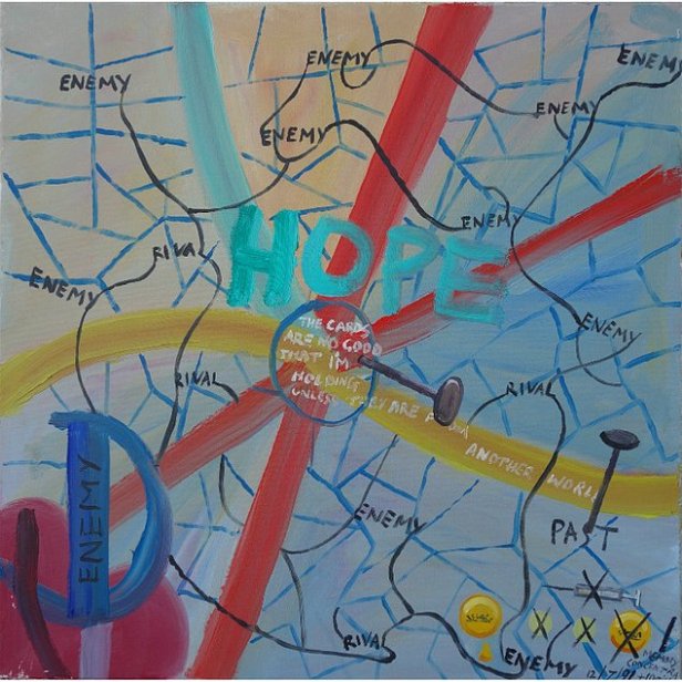 Chanley continued taking high doses of his medication for the next few days. He then received a phone call from his twin, who gave him positive feedback which he describes as, “some words of truth that completely cut through the situation to the bone and rendered the spiritual forces thankfully impotent.” Chanley writes on the canvas the words “Love is strange,” explaining in his diary: