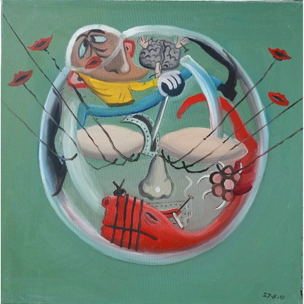 The trouble seemed to me rightly or wrongly, to stem from a broken heart on my left so I painted a great mass of gore there to express this. The foot that connects to this is pushing the mouth open for the thoughts to be broadcasted. I feel I am always divided against my self by myself. Again the nail in the mouth expresses my social ineptitude and an in ability to socialise which makes me a target. Still I feel I am giving off strong personality vibrations, hence the wavy lines emanating from my head.