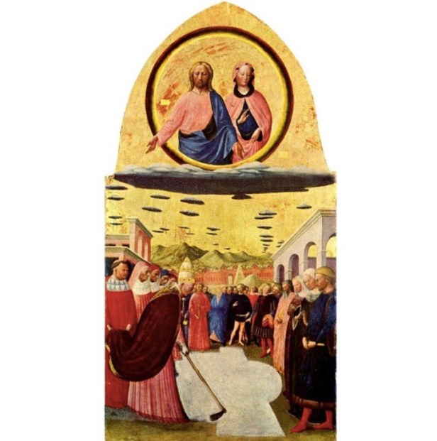 Now tell the truth, does the depiction of “clouds” in the painting resemble actual clouds in anyway, shape or form? Nope. And certainly, they are not snowflakes. Hell no. One of these flakes span the length of the square down below and carry on board Jesus and Mary. These look like spaceships. Not only that, but an entire Armada of ships. In fact, it looks like a bloody ET invasion.The entire legend has characteristics of a close encounter of the 3rd kind, with alien contact made during a dream and then later with the saucers. For a painter to make an amateurish, childlike rendering of clouds seems out of character with someone as highly esteemed and accomplished as Masolino.