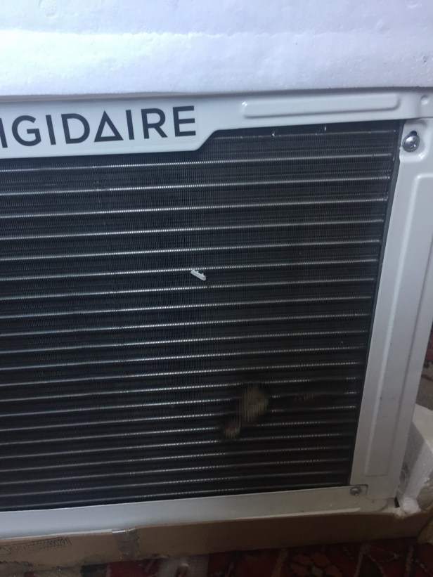 We cared. This AC unit was in shambles. The box looked like it was chewed on by rats. There were dents in the back of the machine. The plastic frame in front was split in the corner, sagging woefully.