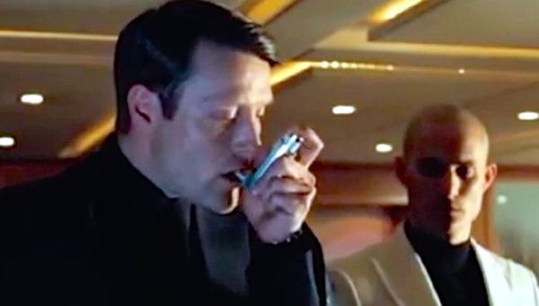 In Moonraker (1955), Bond prepares for a confrontation with the villainous Hugo Drax by availing himself of some powdered courage. Bond “took a silver fruit knife off the table and dipped the tip of the blade into the packet so that about half its contents were transferred to the knife. He reached for his glass of champagne and tipped the powder into it. ‘Benzedrine,’ said James Bond. ‘It is what I shall need if I’m going to keep my wits about me tonight. It’s apt to make one a bit overconfident, but that’ll help too.’ M smiled at him indulgently. “It’s your funeral,” he said. “How were the cutlets?”