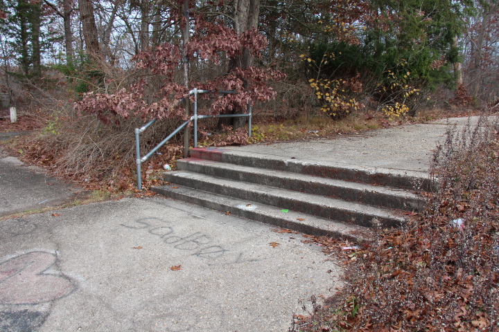 I started taking photos as we ventured deeper into the forest. We reached a fork in the road and decided to go right. We soon came to a clearing. The ground was of asphalt and over to the side there were stone steps. The steps had a metal hand rail but there was nothing else. No building or anything. Just this foundation.