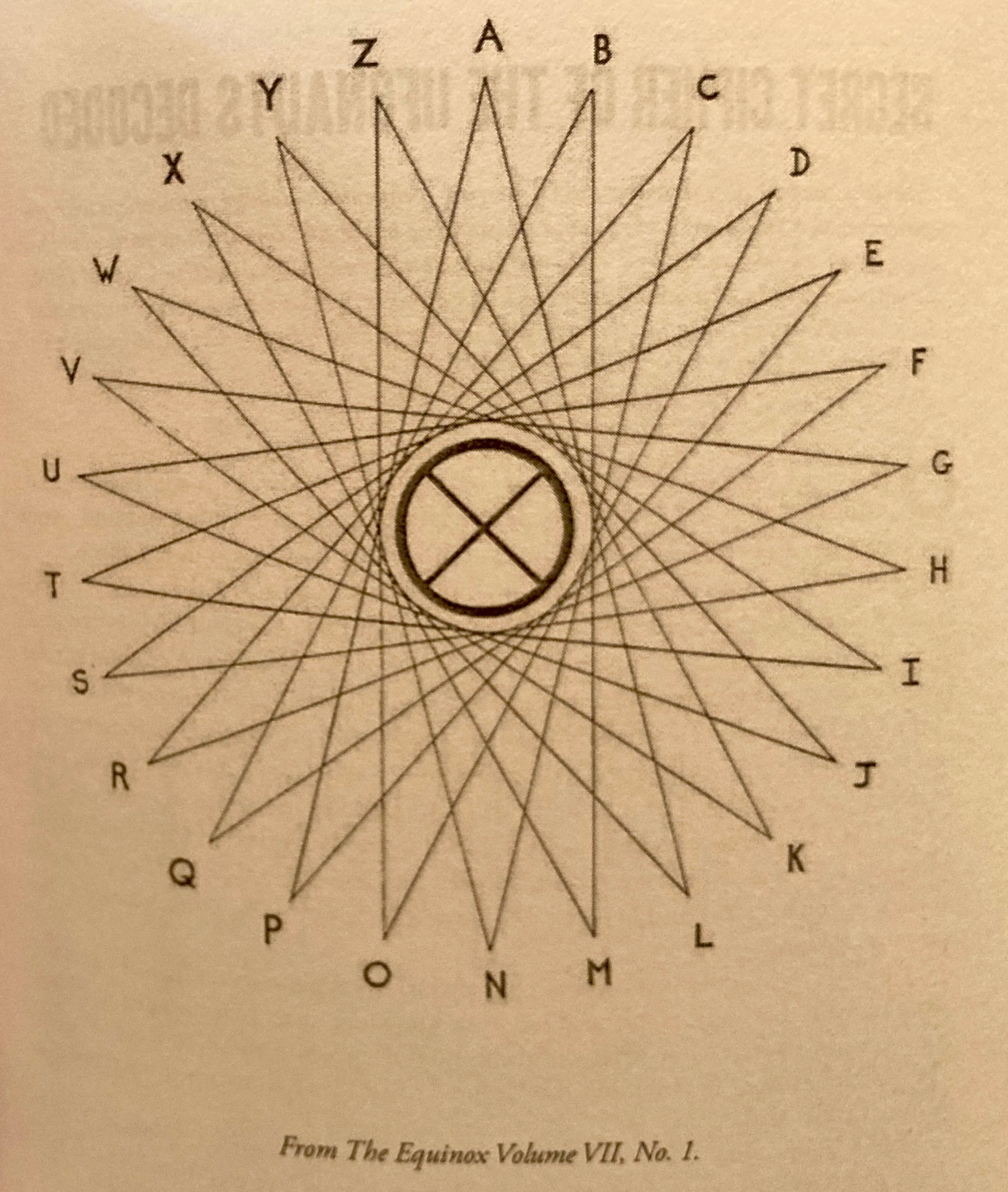 The English Language Cipher uses the 26 letters of the standard alphabet laid out on a grid pattern and plotted on a 26-pointed star built upon the number 11.