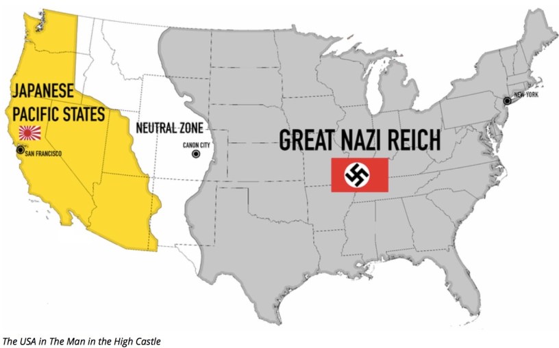 Set in 1962, the opening sequence takes us to New York’s Times Square. There are large billboards depicting Hitler and Nazi swastikas are everywhere. This is a world in which the Axis powers have won World War Two, and a defeated America has been carved into three sections, with the east coast belonging to the Germans, the west to Japan, and the middle Rocky Mountain States acting as a neutral buffer zone.