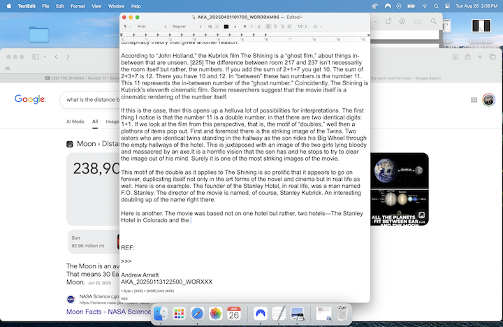 Still at the Denver Airport (the flight was delayed), something struck me regarding the date. The day was 26 August 2025. That made yesterday, August 25, the date of Neil Armstrong’s death. The 237th day of the year. Let me re-iterate: I was in the Stanley Hotel on the 237th day in room 217 when the clock struck midnight. Somehow, I had a strange feeling I wasn’t in Kansas anymore.