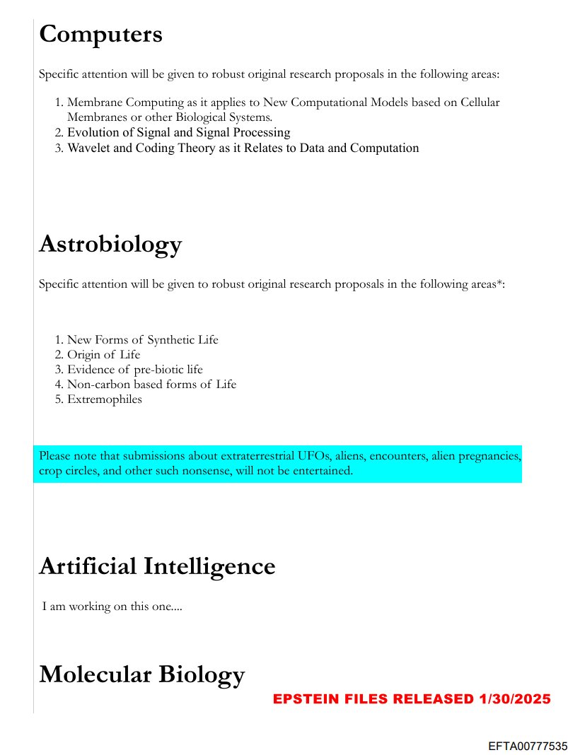 In this document, an email from Jeffrey Epstein to Al Seckel, dated 01 November 2010, Epstein is revising research proposal solicitations, for which he will be providing financial backing. It states, “specific attention will be given to robust original research proposals in the following areas.” Underneath subject headings which include Computers, Astrobiology, Artificial Intelligence and Molecular Biology, he gives specifics. For instance, under Computers, he has the subject line “Membrane computing as it applies to new computational models based on cellular membranes or other biological systems.”