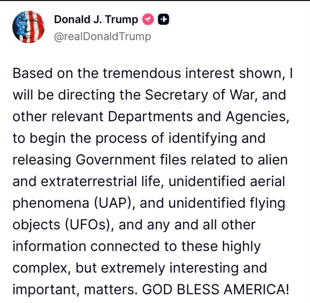 “Based on the tremendous interest shown, I will be directing the Secretary of War, and other relevant Departments and Agencies, to begin the process of identifying and releasing Government files related to alien and extraterrestrial life, unidentified aerial phenomena (UAP), and unidentified flying objects (UFOs), and any and all other information connected to these highly complex, but extremely interesting and important, matters. GOD BLESS AMERICA!”
