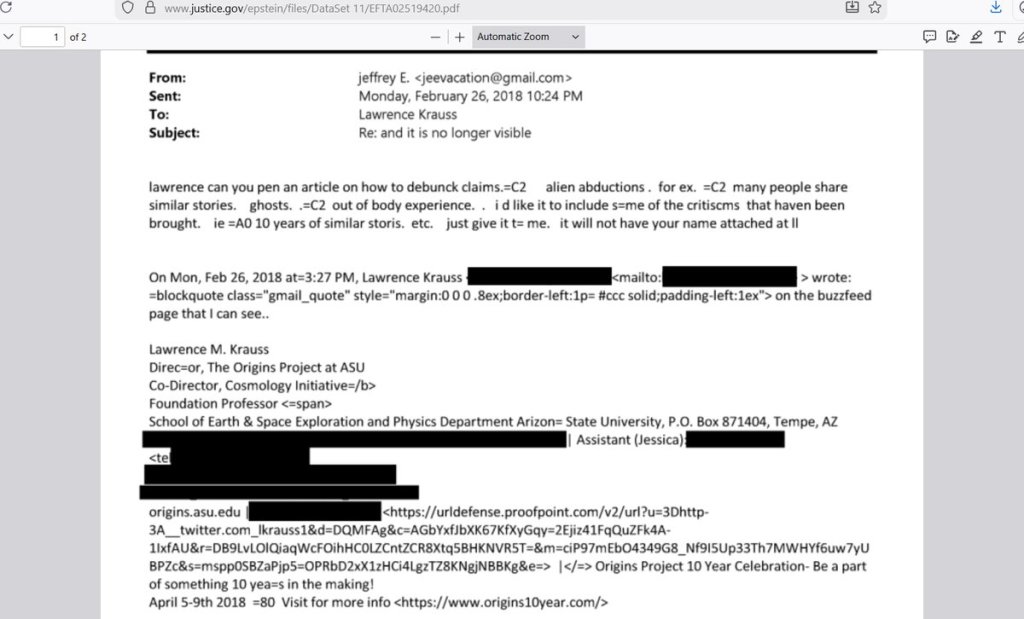 “Here’s how the twisted elite controls the narrative: this is an email in which Epstein demands that Lawrence Krauss write an article on how to debunk out-of-body experiences and alien abductions, while in countless other emails he brags about achieving out-of-body experiences himself and coming up with new ideas. The mainstream must think this is all nonsense, while they exploit it for their own evil purposes.”